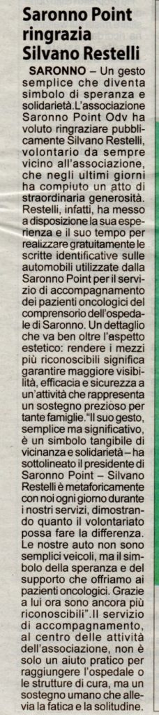 Saronno Point ringrazia Silvano Restelli “un cuore grande a servizio dei malati oncologici”